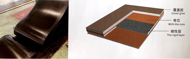 上覆蓋膠、下覆蓋膠、帶芯和橫向剛性層四部分組成基帶,帶芯材料承受拉力,芯材可以是棉帆布(CC)、聚酯帆布(EP)或鋼絲繩(ST)。為了提高基帶的橫向剛性,在芯體增加了一層特殊的加強層,稱為橫向剛性層。