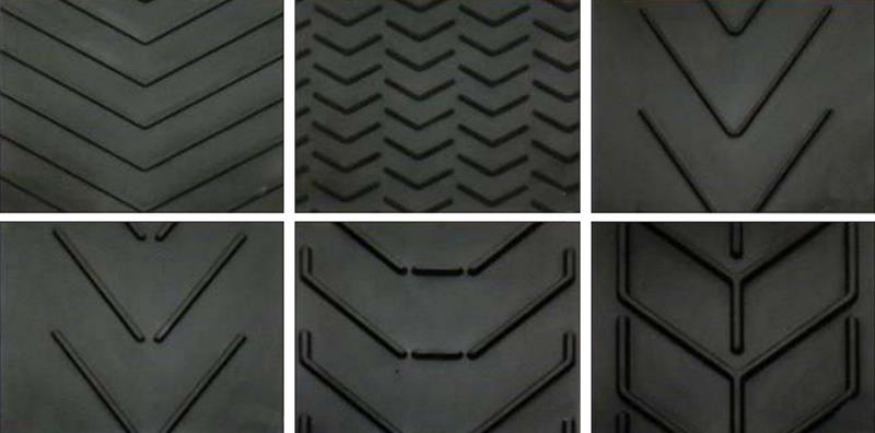 花紋輸送帶由帶體和花紋件組成。根據(jù)輸送長(zhǎng)度和工作強(qiáng)度的要求,帶體可由分層狀織物芯或鋼絲繩芯骨架材料進(jìn)行組成。根據(jù)輸送物料的不同大小和輸送機(jī)角度的不同,對(duì)花紋形狀和高度的要求也不同,每種花紋可分為高、低三種,花紋間距也分為稀疏、密集兩種形式。